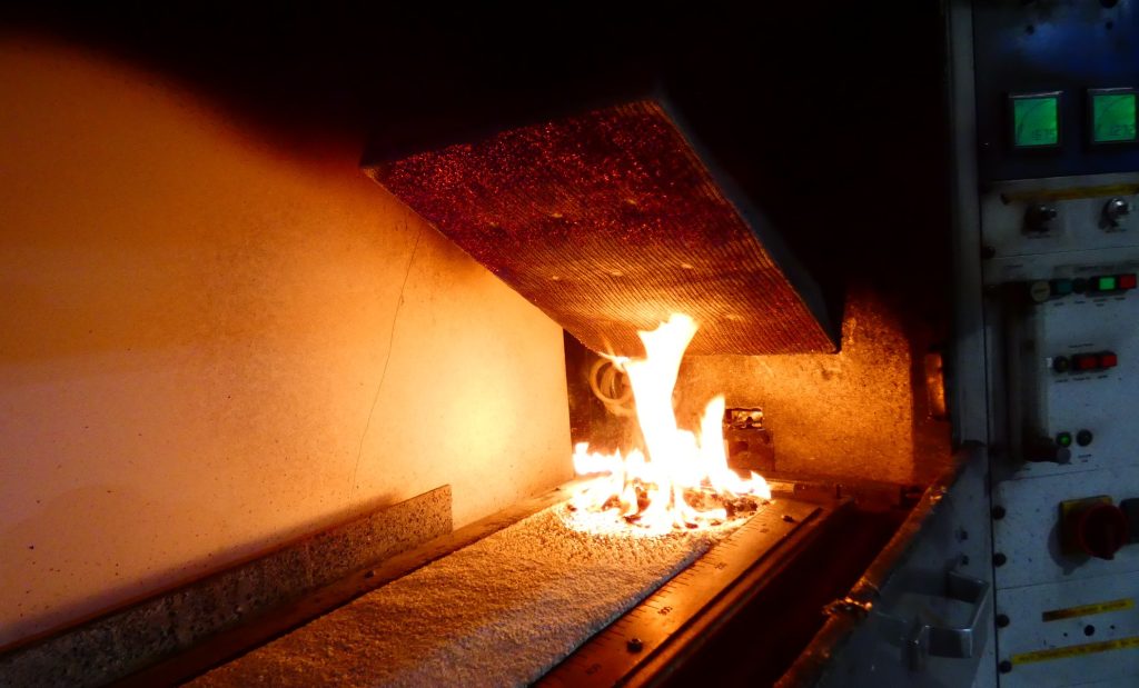 The heat flux at the point of extinction (CHF) is recorded together with the total amount of smoke generated during the test (Smoke Value).