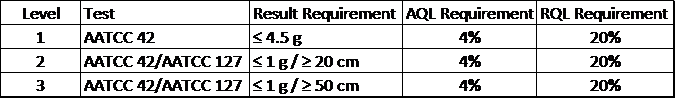 The standard also specifies a sampling plan for testing based on a statistical Acceptable Quality Level (AQL) and Rejectable Quality Level (RQL):